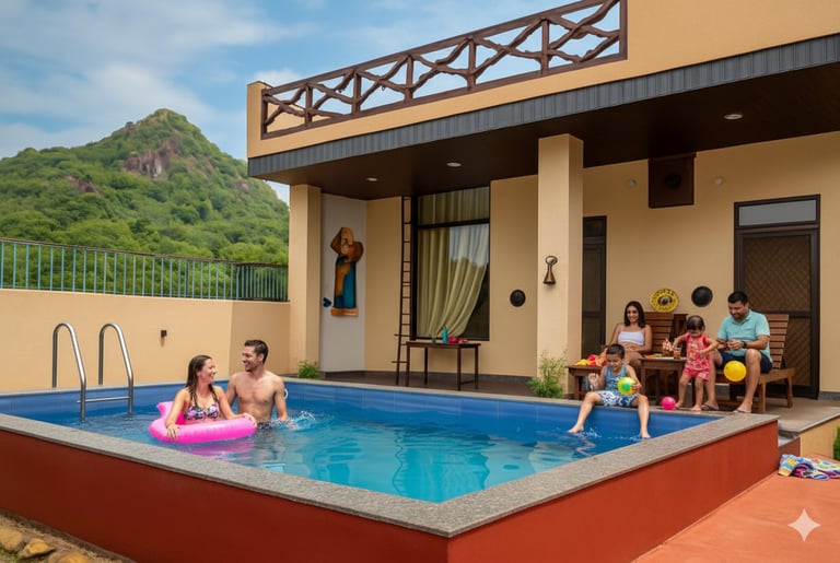 Live like royalty in a private pool villa at Aaram Bagh Resort Ranthambore. Enjoy personalized terrace tea, high tea evenings, delicious breakfasts at scenic spots, dinner at your villa, and a mesmerizing bush dinner at Jungle Farm. Best choice for those seeking privacy, luxury, and nature.