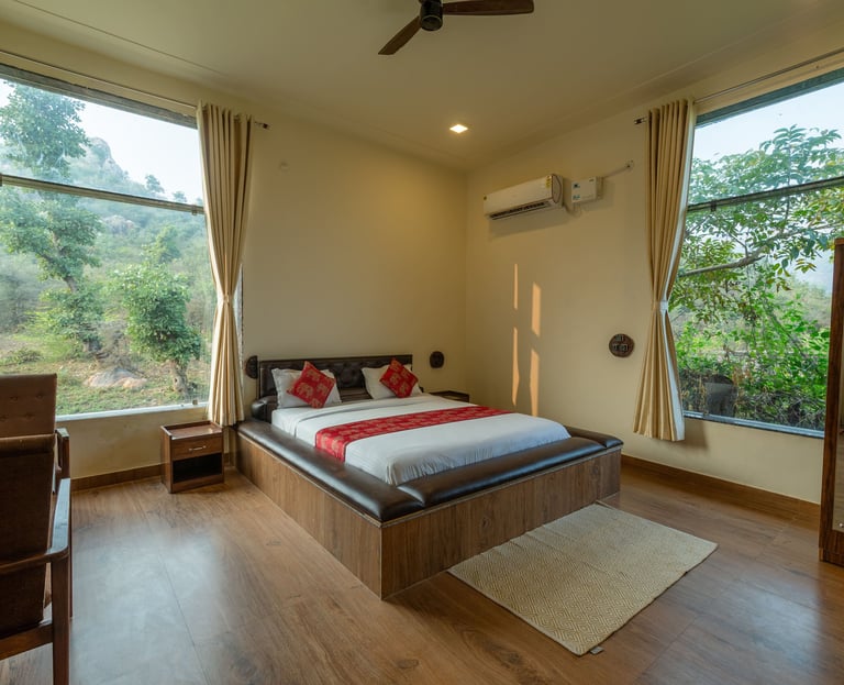 Surround yourself with the charm of the wild! Our Jungle View Rooms offer a mesmerizing view of lush greenery and the rhythmic sounds of the forest. The room features elegant interiors, cozy bedding, and modern amenities — creating the perfect balance between rustic charm and contemporary luxury.