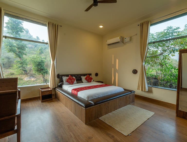 Discover the perfect harmony of nature and indulgence at our Luxury Wilderness Retreat. Surrounded by the untamed beauty of Ranthambore, this retreat offers an escape where modern elegance meets the raw charm of the jungle. Wake up to the sounds of nature, unwind in spacious villas with world-class comforts, and explore thrilling wildlife safaris just minutes away. Whether you seek adventure, tranquility, or a blend of both, our retreat creates an unforgettable experience where every moment reflects luxury in the lap of wilderness. Ranthambore wildlife retreat.